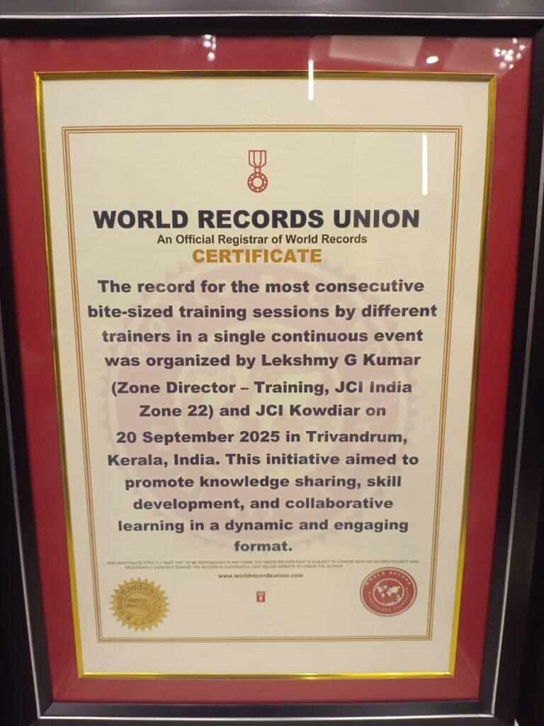 തിരുവനന്തപുരം: വേള്‍ഡ് റോക്കോര്‍ഡിന്റെ നിറവില്‍ ജെസിഐ ഇന്ത്യ സോണ്‍ 22 ഉം ലക്ഷ്മി ജി കുമാറും. ജെസിഐയുടെ ആഭിമുഖ്യത്തില്‍ സംഘടിപ്പിച്ച ‘ലക്ഷ്യ മെഗാ ട്രെയിനിങ് മാരത്തണ്‍’ എന്ന പരിപാടിയാണ് വേല്‍ഡ് റെക്കോര്‍ഡിലേക്ക് വഴി തെളിച്ചത്. ഒരേ വേദിയില്‍ 52 ട്രെയിനര്‍മാരാണ് 52 വ്യത്യസ്ത വിഷയങ്ങളില്‍ ചുരുങ്ങിയ സമയത്തിനുള്ളില്‍ ഈ പരിപാടിയിലൂടെ തങ്ങളുടെ വിഷയം അവതരിപ്പിച്ചത്.